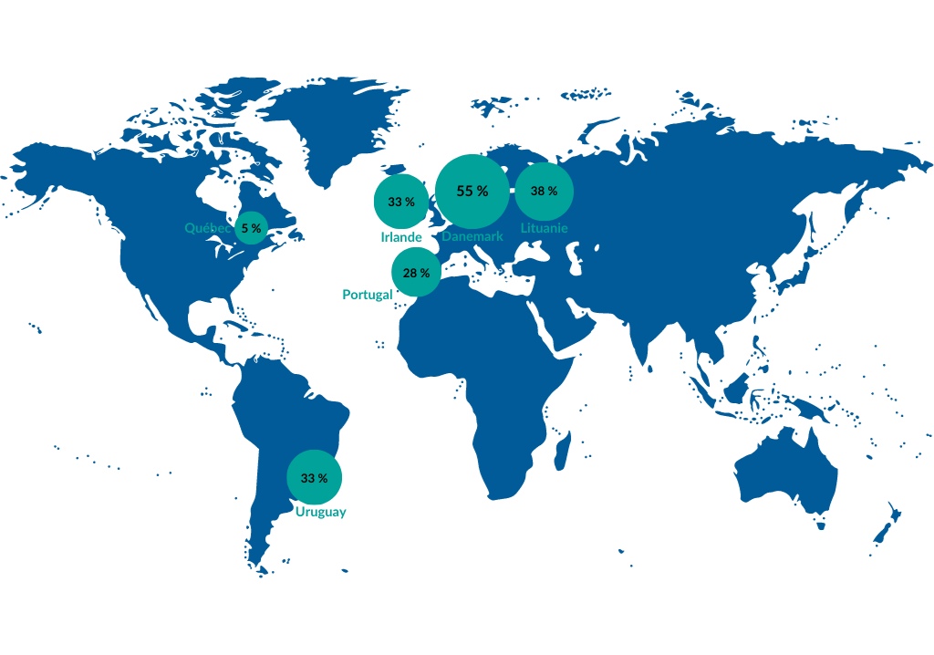 - Les pays où les taux de pénétration de l’énergie éolienne installée sont les plus élevés sont le Danemark (7 088 MW), la Lituanie (814 MW), l’Irlande (4 619 MW), l’Uruguay (1 514 MW) et le Portugal (5 455 MW)12,13.